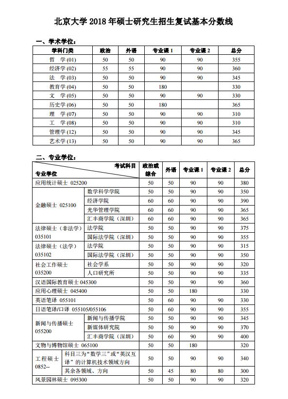 北京大學(xué)2018年碩士研究生招生復(fù)試基本分?jǐn)?shù)線如下: