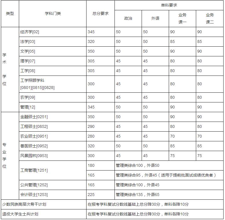 說(shuō)明:1、上表為我?;緩?fù)試分?jǐn)?shù)要求,生源充裕學(xué)院可根據(jù)整體考試情況、招生計(jì)劃、學(xué)科專業(yè)特點(diǎn)等,上調(diào)分?jǐn)?shù)要求,但差額復(fù)試比例不得低于120%。報(bào)考該類學(xué)院的考生須達(dá)到學(xué)院公布的復(fù)試分?jǐn)?shù)要求才能參加復(fù)試。學(xué)院調(diào)整后的復(fù)試分?jǐn)?shù)線、復(fù)試辦法,由各院近日公布,請(qǐng)考生密切留意。