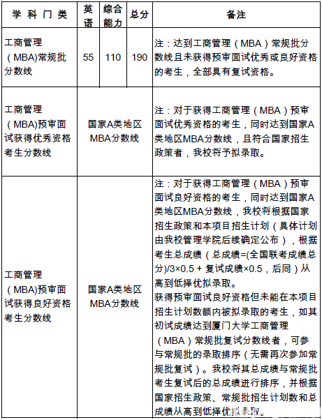 廈門大學(xué)2019年入學(xué)MBA研究生復(fù)試分?jǐn)?shù)線,經(jīng)學(xué)校招生工作領(lǐng)導(dǎo)小組會(huì)議研究決定,劃分如下: