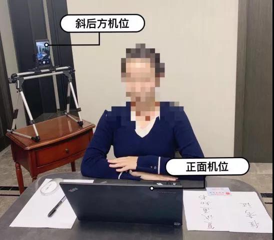 考生要雙機(jī)位模式參加復(fù)試,即需要注冊(cè)申請(qǐng)兩個(gè)獨(dú)立賬號(hào)同時(shí)進(jìn)入候考室或復(fù)試室,分別登陸兩部帶攝像頭的設(shè)備,手機(jī)或電腦均可。一臺(tái)設(shè)備從正面拍攝,另一臺(tái)設(shè)備從考生側(cè)后方拍攝。考生端兩臺(tái)設(shè)備開啟攝像頭,一臺(tái)設(shè)備將攝像頭對(duì)準(zhǔn)考生本人,另一臺(tái)設(shè)備攝像頭從考生后方成45°拍攝(后方拍攝的設(shè)備須靜麥和關(guān)閉音頻,防止回音影響復(fù)試),并保證考生端考試屏幕能清晰地被復(fù)試專家組看到。
