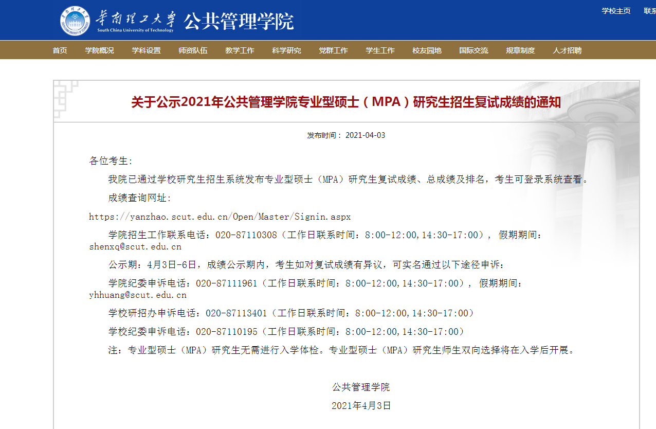 華南理工大學(xué)2021年MPA研究生招生復(fù)試成績(jī)的通知院校動(dòng)態(tài)