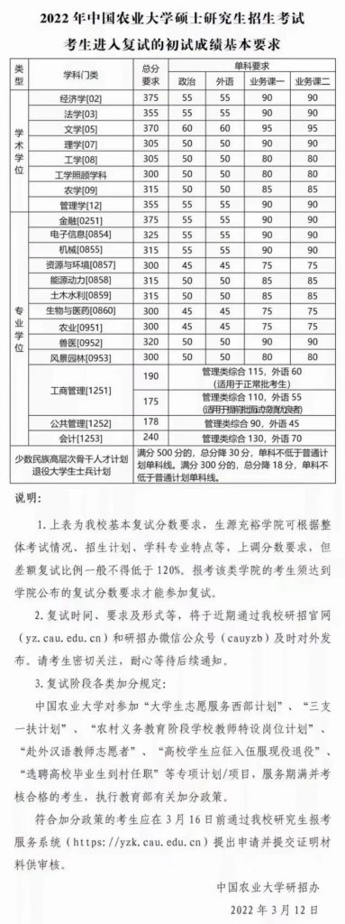 2022年中國農(nóng)大研考復試基本分數(shù)線發(fā)布院校動態(tài)
