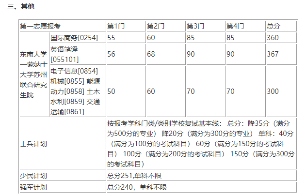 2. 統(tǒng)考考生(不含報(bào)考東南大學(xué)-蒙納士大學(xué)蘇州聯(lián)合研究生院考生和管理類聯(lián)考考生)總分超過(guò)報(bào)考院(系)專業(yè)/方向復(fù)試線20分以上(含20分)者,單科(限一門)可降2分。