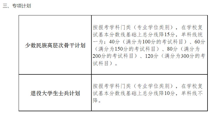1.參加“大學(xué)生志愿服務(wù)西部計(jì)劃”“三支一扶計(jì)劃”“農(nóng)村義務(wù)教育階段學(xué)校教師特設(shè)崗位計(jì)劃”“赴外漢語(yǔ)教師志愿者”等項(xiàng)目服務(wù)期滿、且考核合格的考生,3年內(nèi)參加全國(guó)碩士研究生招生考試的,初試總分加10分,同等條件下優(yōu)先錄取。