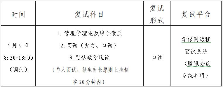 (三)復(fù)試成績(jī)以 100 分為滿分,計(jì)算方式如下:復(fù)試成績(jī)=管理學(xué)理論及綜合素質(zhì)成績(jī)×60%+英語(聽力、口語)×20%+思想政治理論成績(jī)×20%。