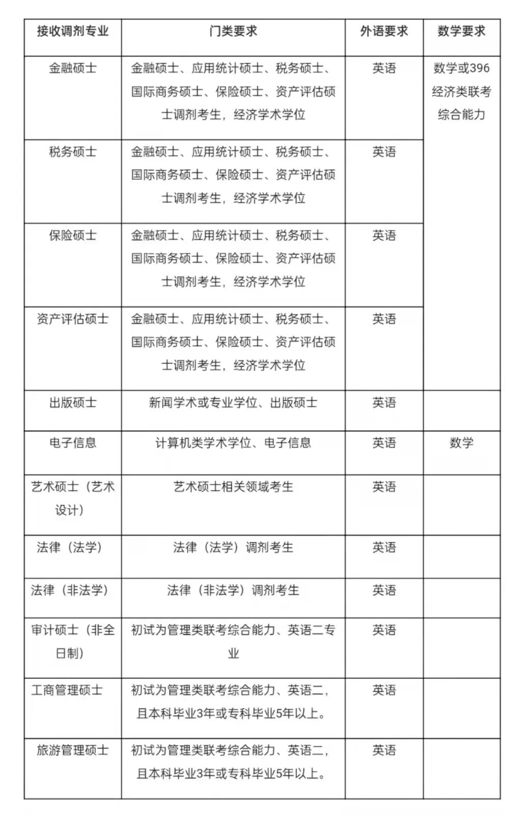 調(diào)劑考生符合報考專業(yè)的報考條件,已達(dá)我校復(fù)試資格線。調(diào)入專業(yè)與第一志愿報考專業(yè)相同或相近,初試科目與調(diào)入專業(yè)初試科目相同或相近,其中統(tǒng)考科目原則上應(yīng)相同。原則上第一志愿報考專業(yè)學(xué)位專業(yè)的考生不能調(diào)劑到學(xué)術(shù)學(xué)位專業(yè)。我校具體調(diào)劑接收專業(yè)請登錄研招網(wǎng)查看。