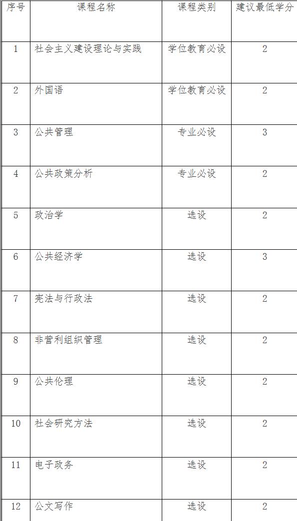 1.核心課是學(xué)生必修課程。“核心課程目錄”共列12門課,其中,“社會主義建設(shè)理論與實(shí)踐”和“外國語”為學(xué)位教育必設(shè)課程;“公共管理”和“公共政策分析”是本專業(yè)必設(shè)核心課程;其他核心課程,由各培養(yǎng)院校從“核心課程目錄”中選擇開設(shè)。