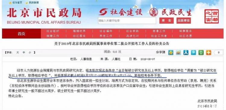 2019年8月份的時候,北京市民政局官網發(fā)布的一條招考工作人員公告中,事業(yè)單位首次將非全和全日制放在同等地位,兌現了教育部文件中提到的:全日制和非全日制研究生實行相同的考試招生政策和培養(yǎng)標準,其學歷學位證書具有同等法律地位和相同效力。